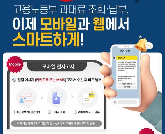 고용노동부는 12월 22일부터 고용노동관계법 위반 과태료 고지서를 모바일과 웹에서 조회·납부할 수 있는 전자고지 서비스를 시행한다고 밝혔다.