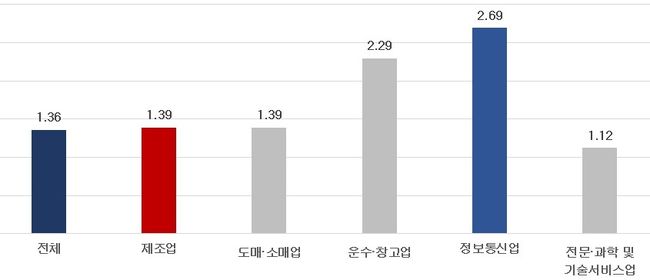 분석 결과, 특허·상표·디자인 중 하나라도 지식재산권 출원 활동을 선행한 중소기업의 고성장 가능성은 출원하지 않은 기업 대비 1.36배 높았다. 업종별로는 정보통신업이 2.69배로 가장 컸고, 중소기업 비중이 가장 높은 제조업도 1.39배로 나타났다.